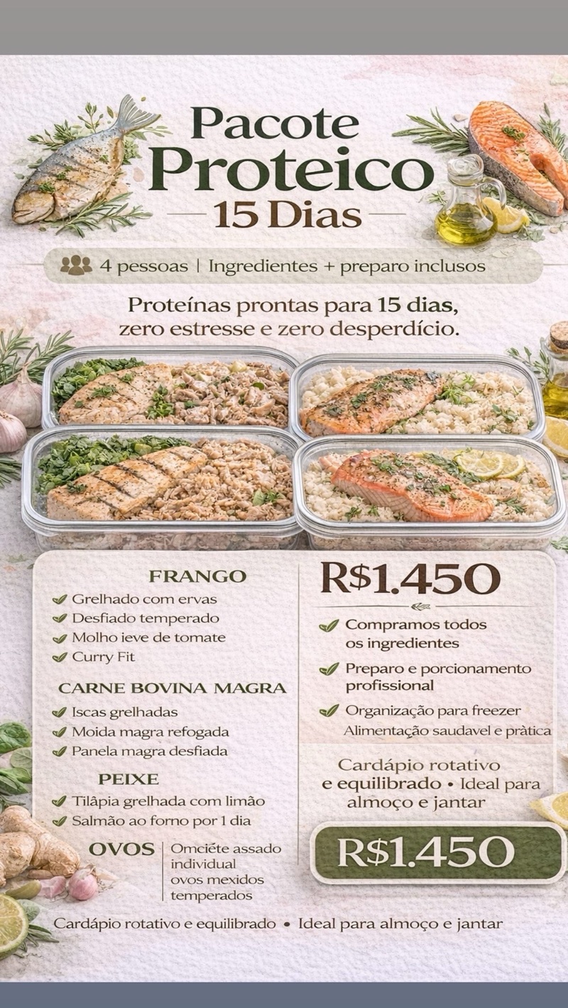 Proteínas prontas para 15 dias, zero stresse e zero desperdício. Cardápio a escolher: Peito de frango grelhado Frango desfiado temperado Frango em cubos com legumes Frango ao molho caseiro Base do cardâpio (mais econômico) Carne Bovina Carne moida refogada Picadinho de carne com legumes Carne de panela simples › Usada em dias alternados Suíno Lombo suíno assado ou grelhado Pernil suíno em cubos Peixe (econômico) Opcão econômica para variar o sabor Filé de peixe empanado assado Peixe grelhado com limão e ervas Ovos Ovos cozidos Omelete simples MAIS 10 acompanhamentos