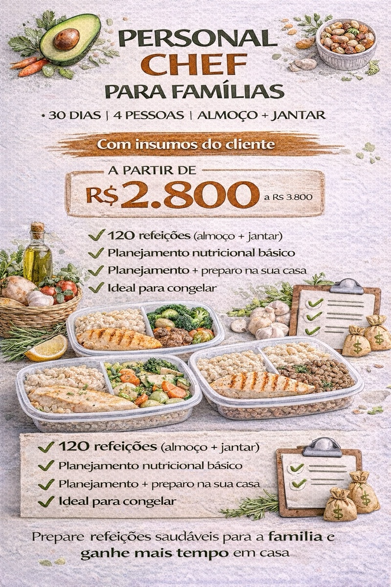Almoço + jantar | 15 dias | 4 pessoas Cozinho na sua casa todas as refeições de almoço e jantar para 15 dias, utilizando os insumos do cliente, com organização, porcionamento e praticidade para a sua rotina. O que está incluso nesse tempo: O serviço inclui: • Planejamento do cardápio (simples, equilibrado e adaptado ao casal) • Organização da cozinha • Higienização e pré-preparo dos alimentos • Preparo de aproximadamente 60 refeições • Porcionamento e identificação básica • Organização e limpeza final da cozinha