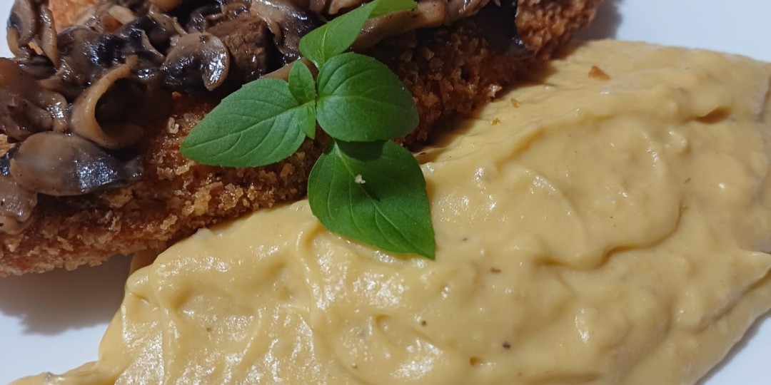Risoto com.laminas de filet ao molho madeira